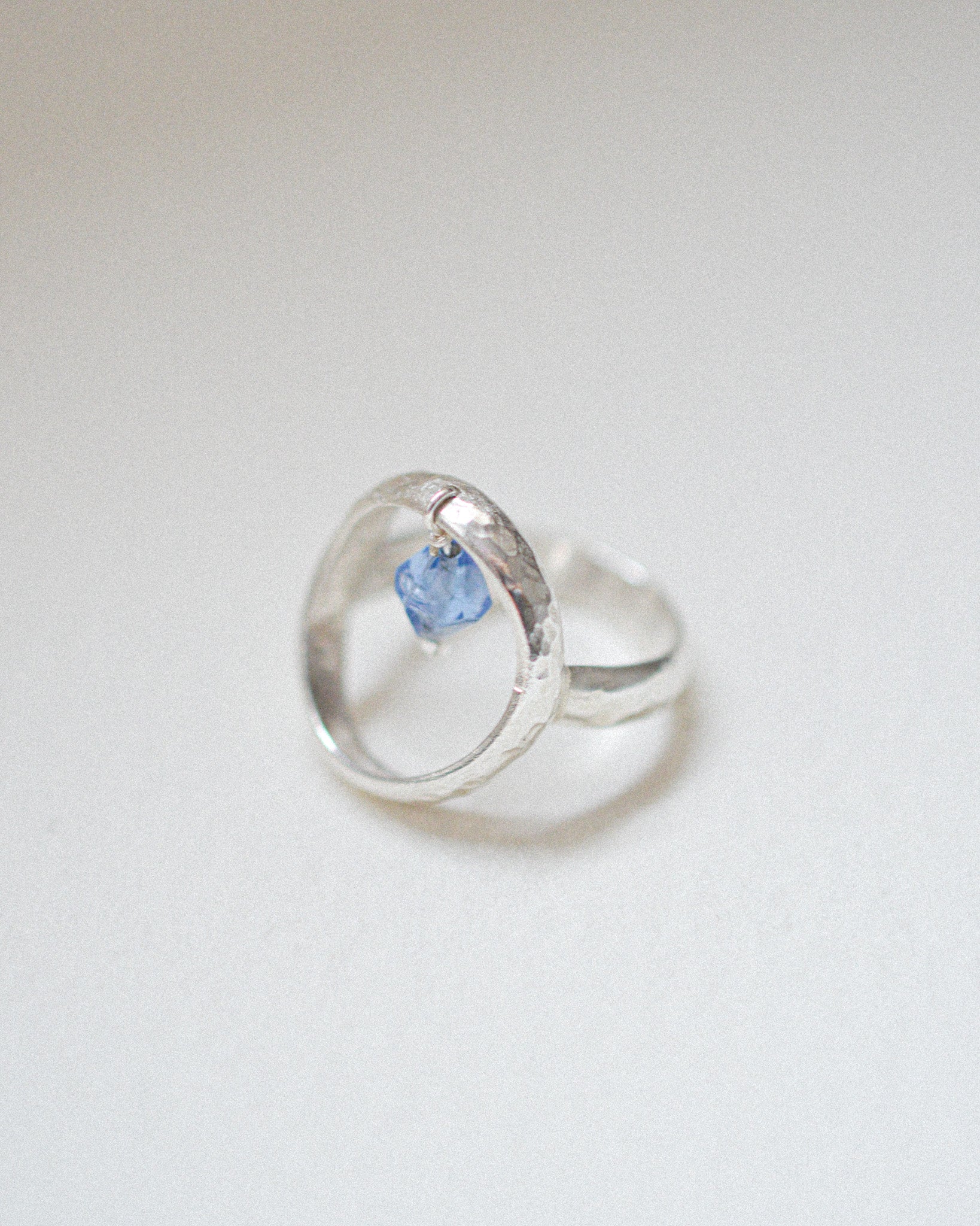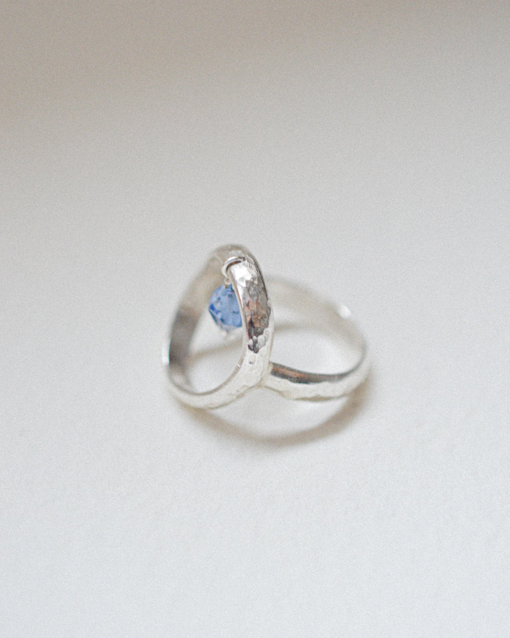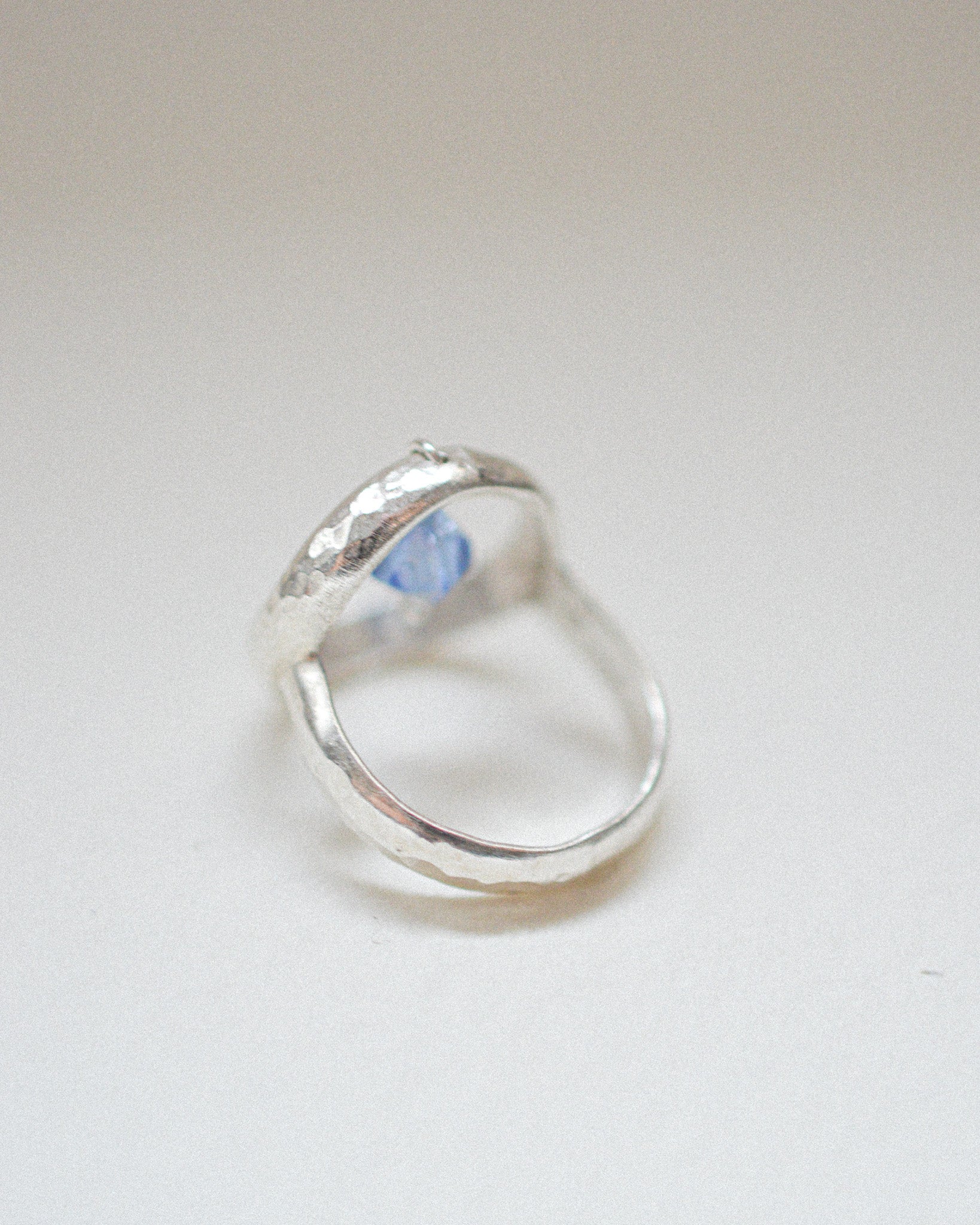 Ring in sterling silver with a hammered texture and an up-cycled glass pearl in a blue color.
