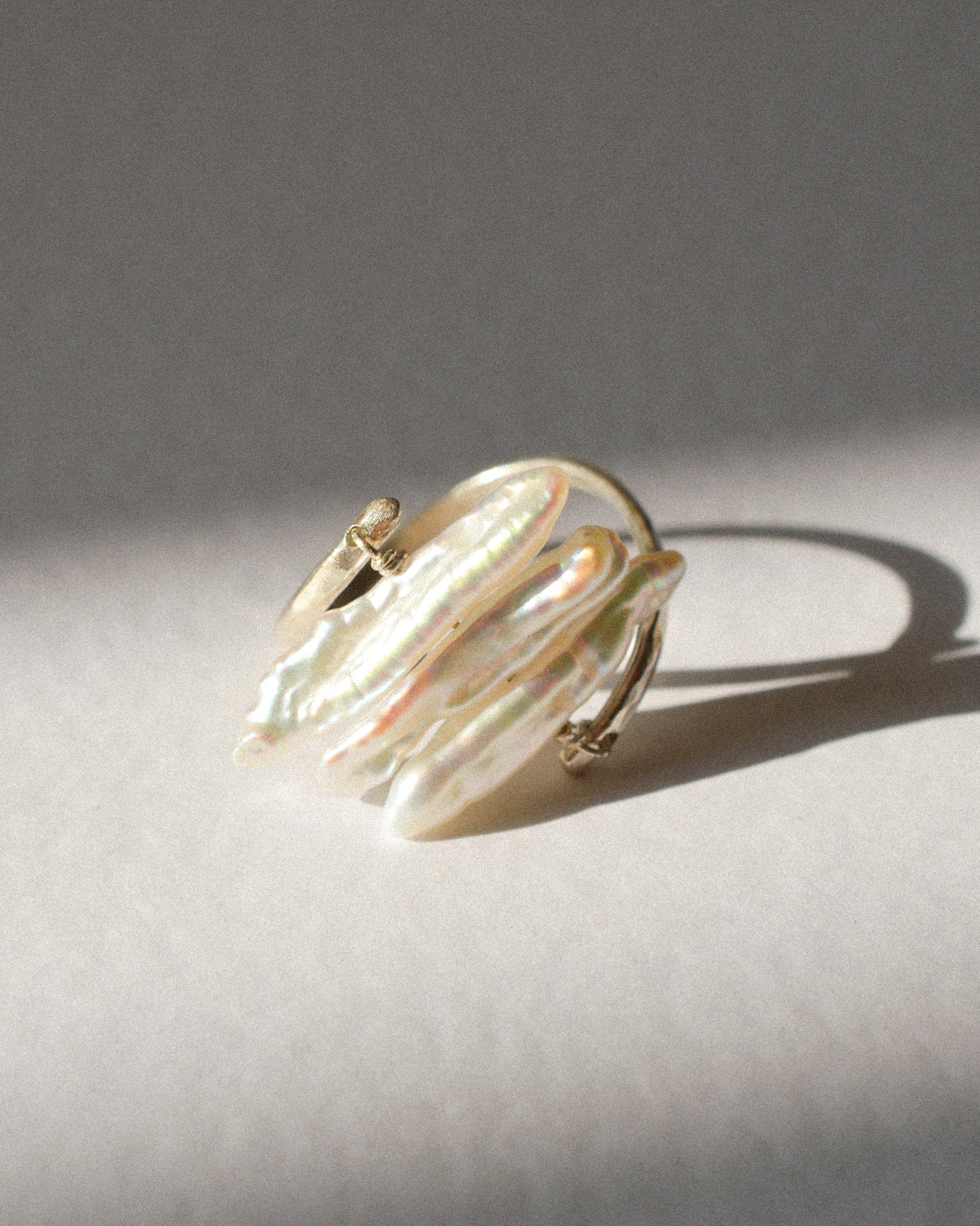 Ring in sterling silver with a hammered texture and upcycled Keshi sweet water pearls. The ring is twisted and the diameter is measured from the middle of the ring.