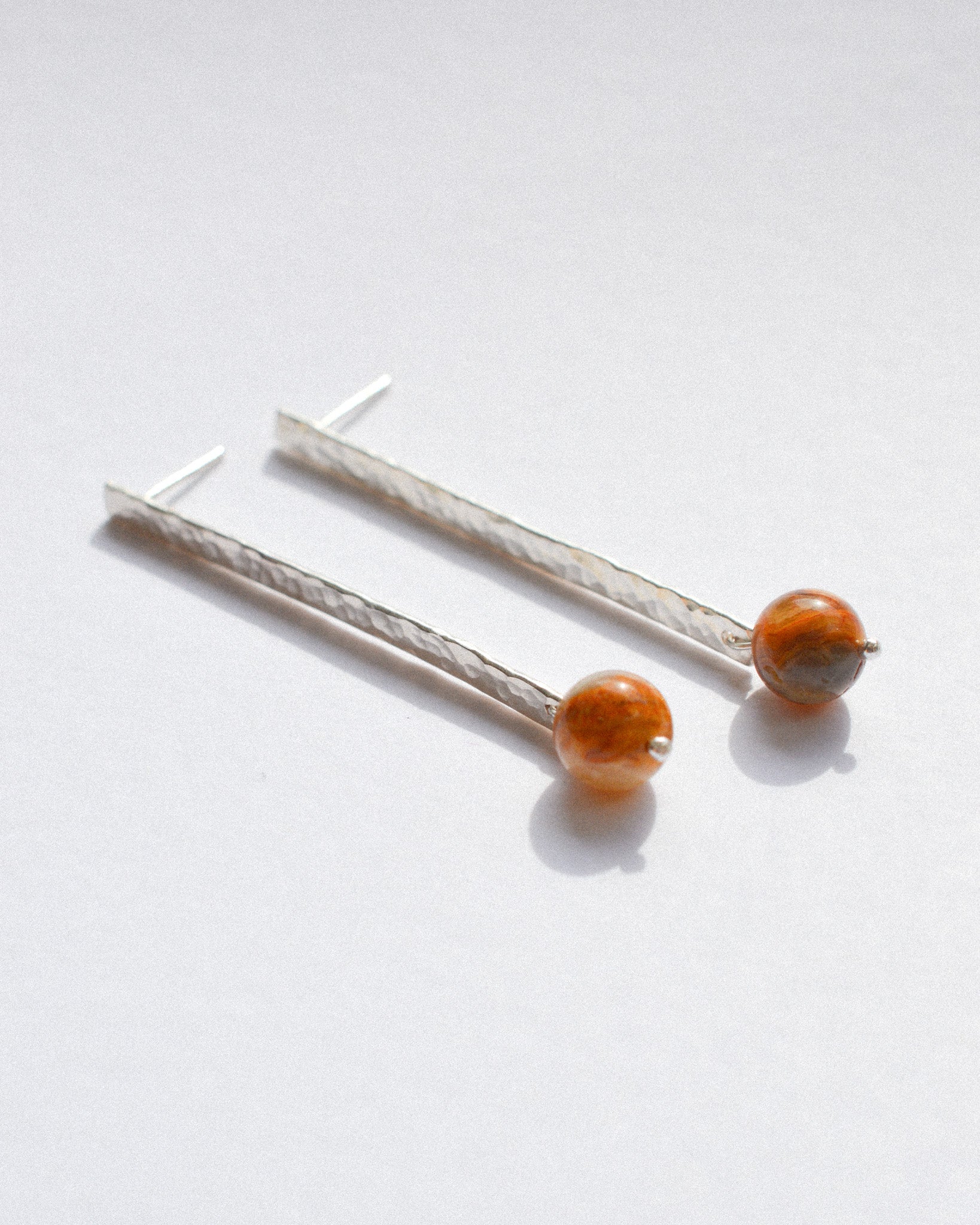 Earrings in sterling silver with a hammered texture and up-cycled agate stones in orange/brown tones. Earring backs are included.