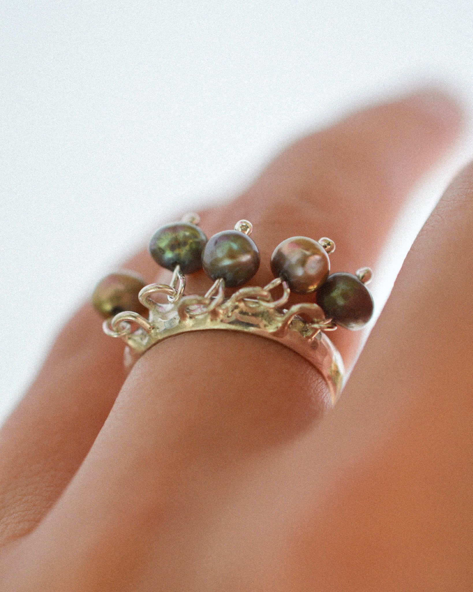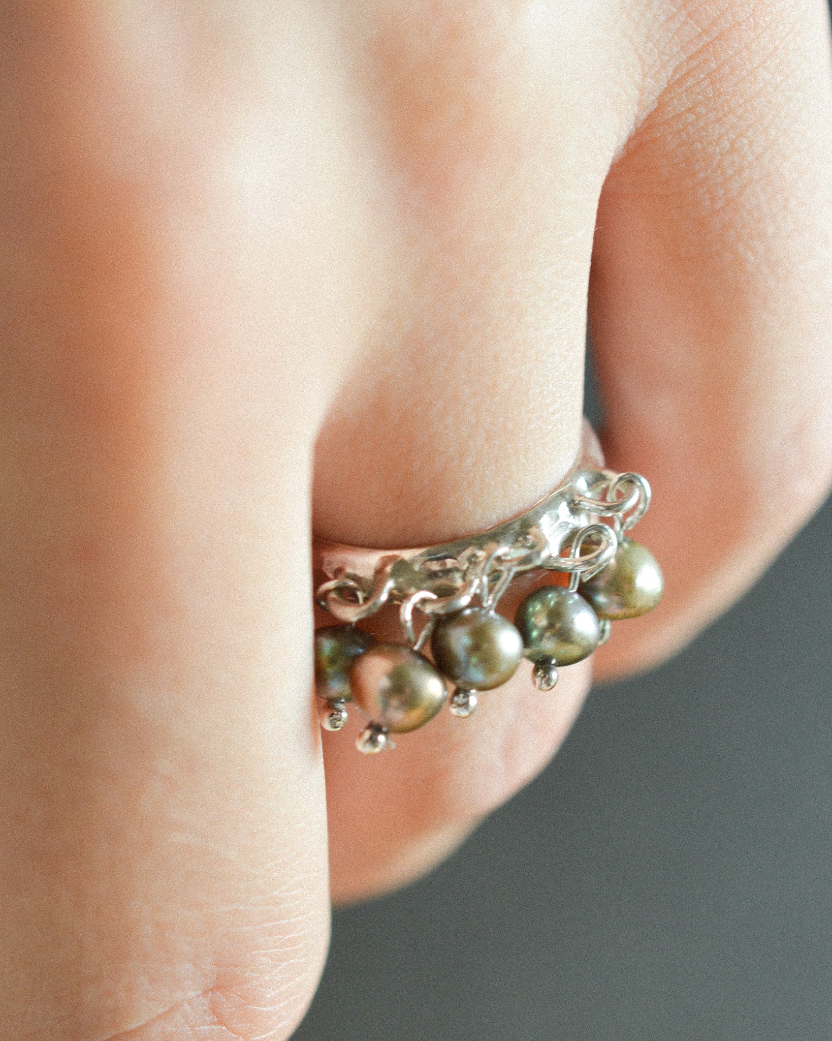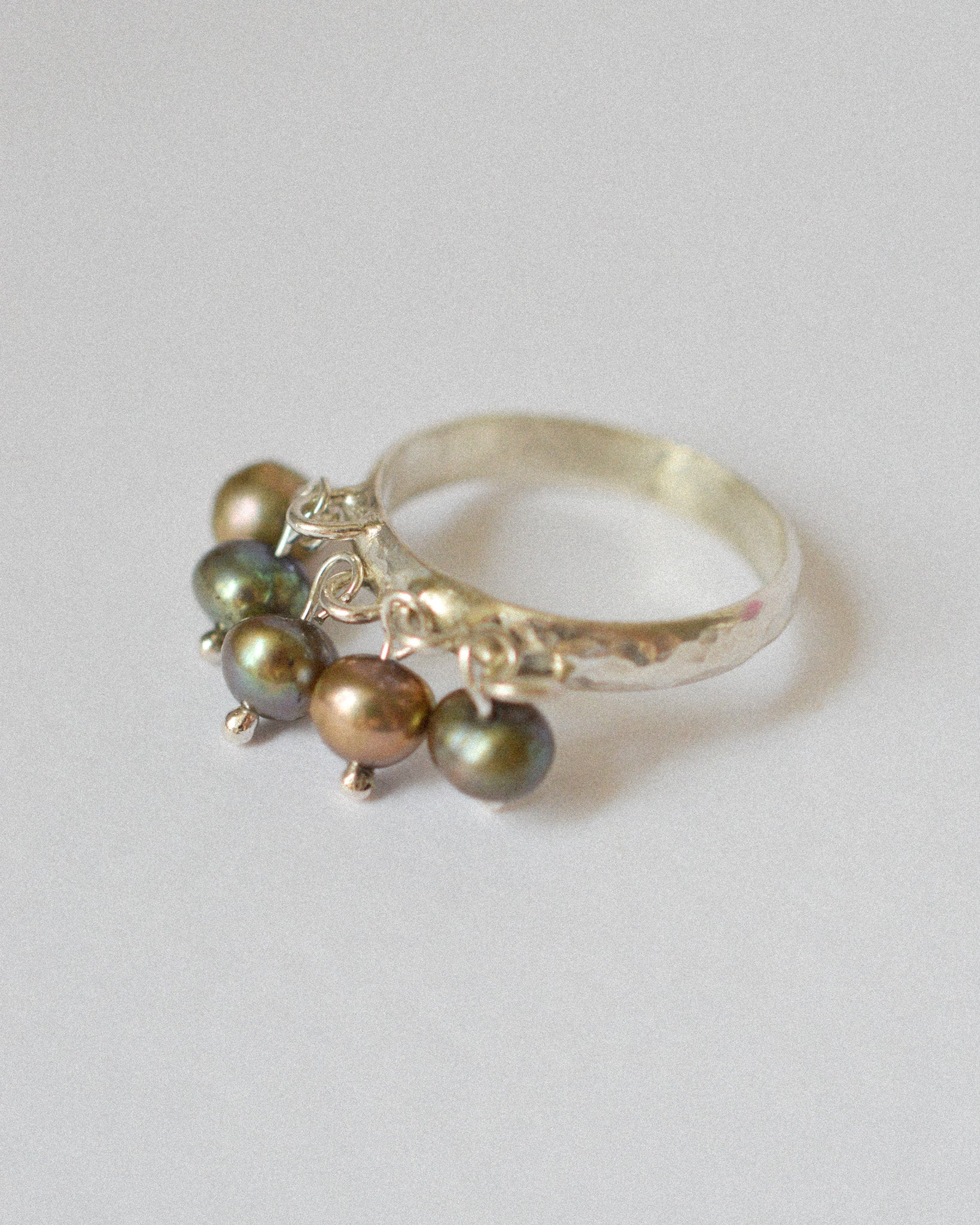 Ring in sterling silver with a flat hammered texture and recycled fresh water pearls.