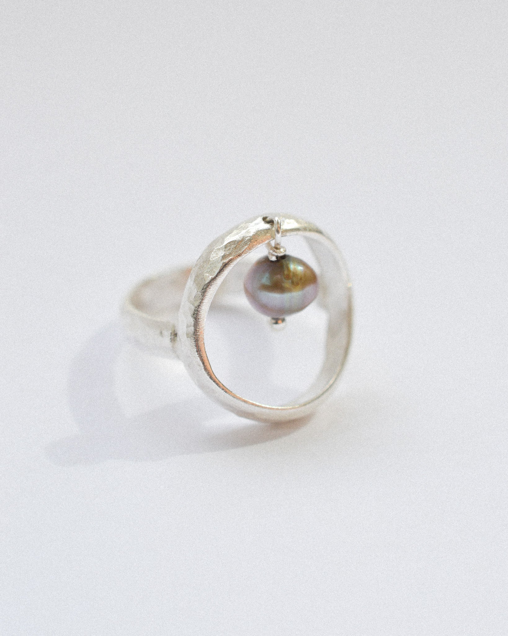 Ring in sterling silver with a hammered texture and an up-cycled pearl in a blue color.